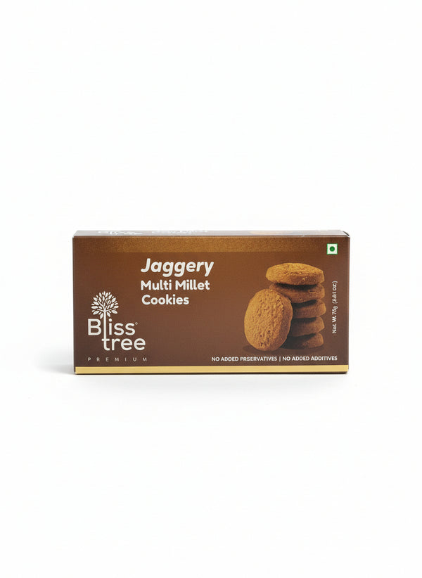 Power up and supercharge your health with the super- delicious Bliss Tree Jaggery Cookies. Millets are just great delicious grain loaded with nutrients and absolutely superhit formula for having guilt-free cookies. Yes, there is no addition of maida nor any artificial flavors and emulsifiers. You can fully enjoy these cookies with fun and pleasure.